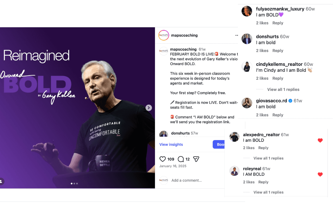 Built a comment-trigger mechanic: posts prompted followers to comment "BOLD" to receive location-based program info via DM, turning organic engagement into a trackable lead funnel.